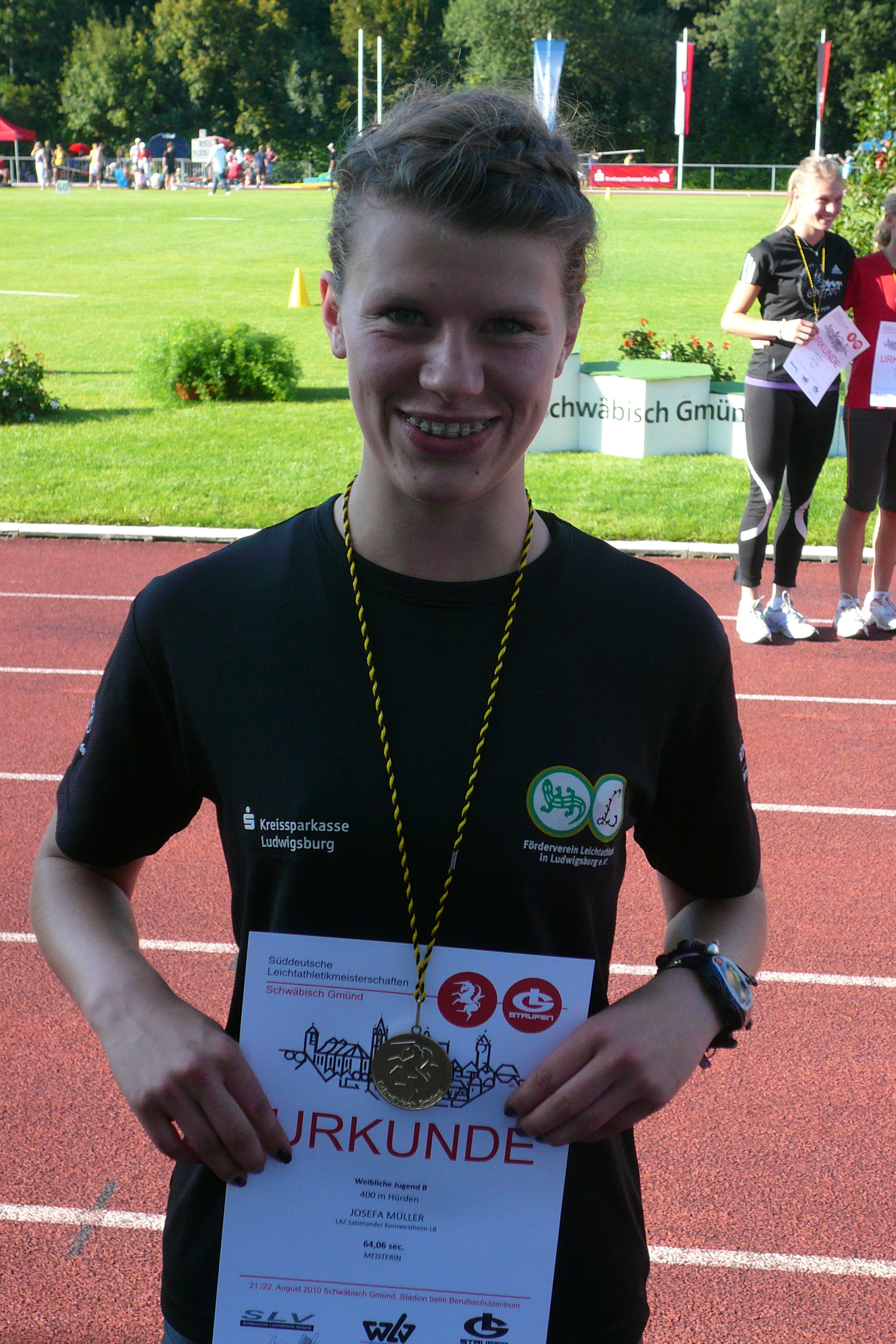 Die noch 15-järige Josefa Müller, die Senkrechtstarterin über die 400m Hürden, krönte ihre tolle Saison mit einem weiteren Klasse Rennen. Die Siebte der Deutschen Jugendmeisterschaften kam in ihrem letzten Lauf noch ein Mal bis auf zwei Hundertstel Sekunden an ihre persönliche Bestzeit und konnte sich in einem knappen Finish in der Zeit von 64,06 den Süddeutschen Meistertitel sichern. Knapp dahinter lief Luisa Valeske (SV Schlau. Com Saarbrücken) in 64,07 Sekunden zur Vizemeisterschaft.