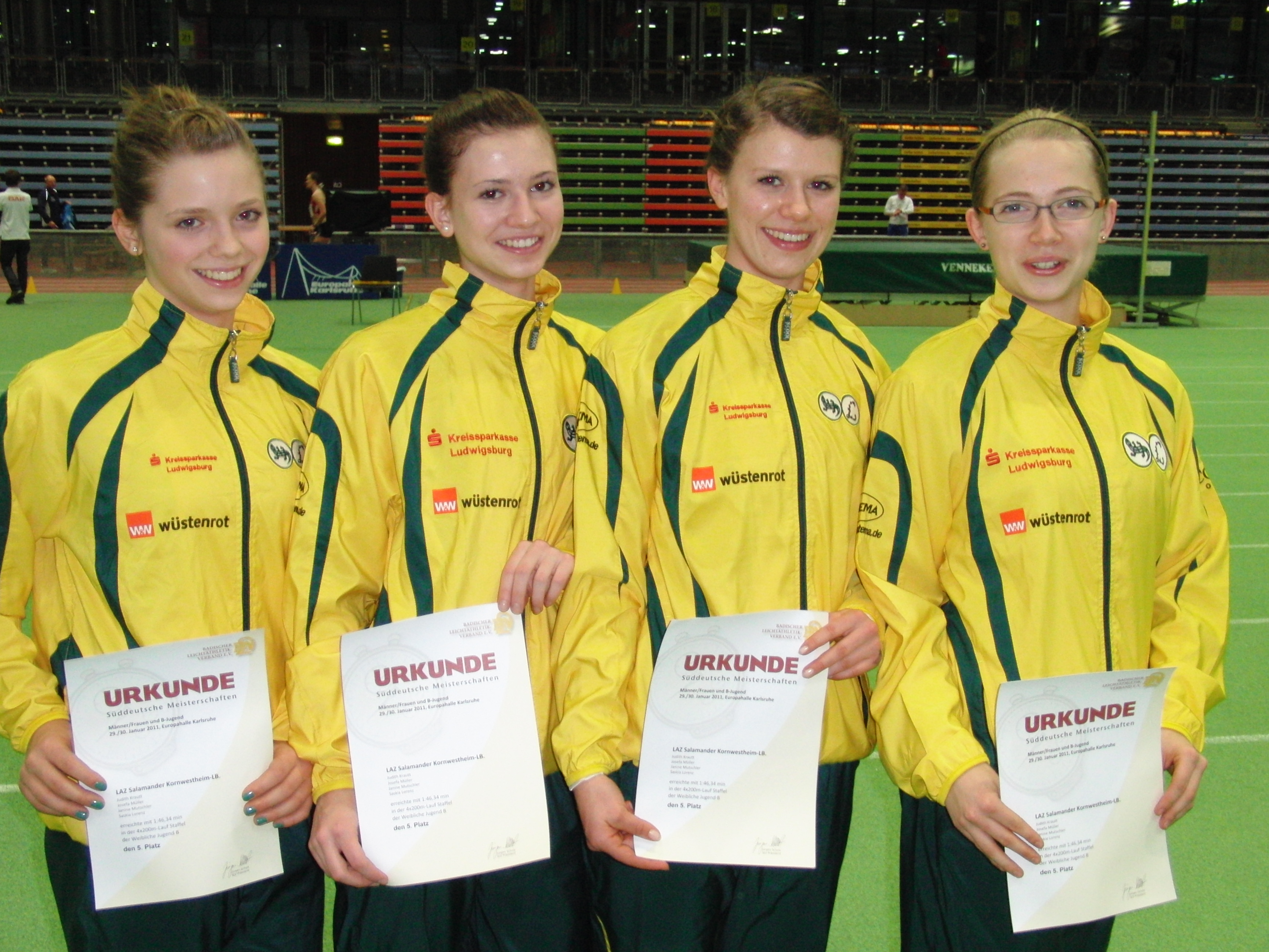Auch die 4x200m Staffel der weiblichen Jugend B konnte sich unter vierzehn teilnehmenden Staffeln gut präsentieren! In der Besetzung Judith Krautt, Josefa Müller, Janine Mutschler und Saskia Lorenz lief das LAZ-Team in 1:46,34 Minuten auf Rang fünf.