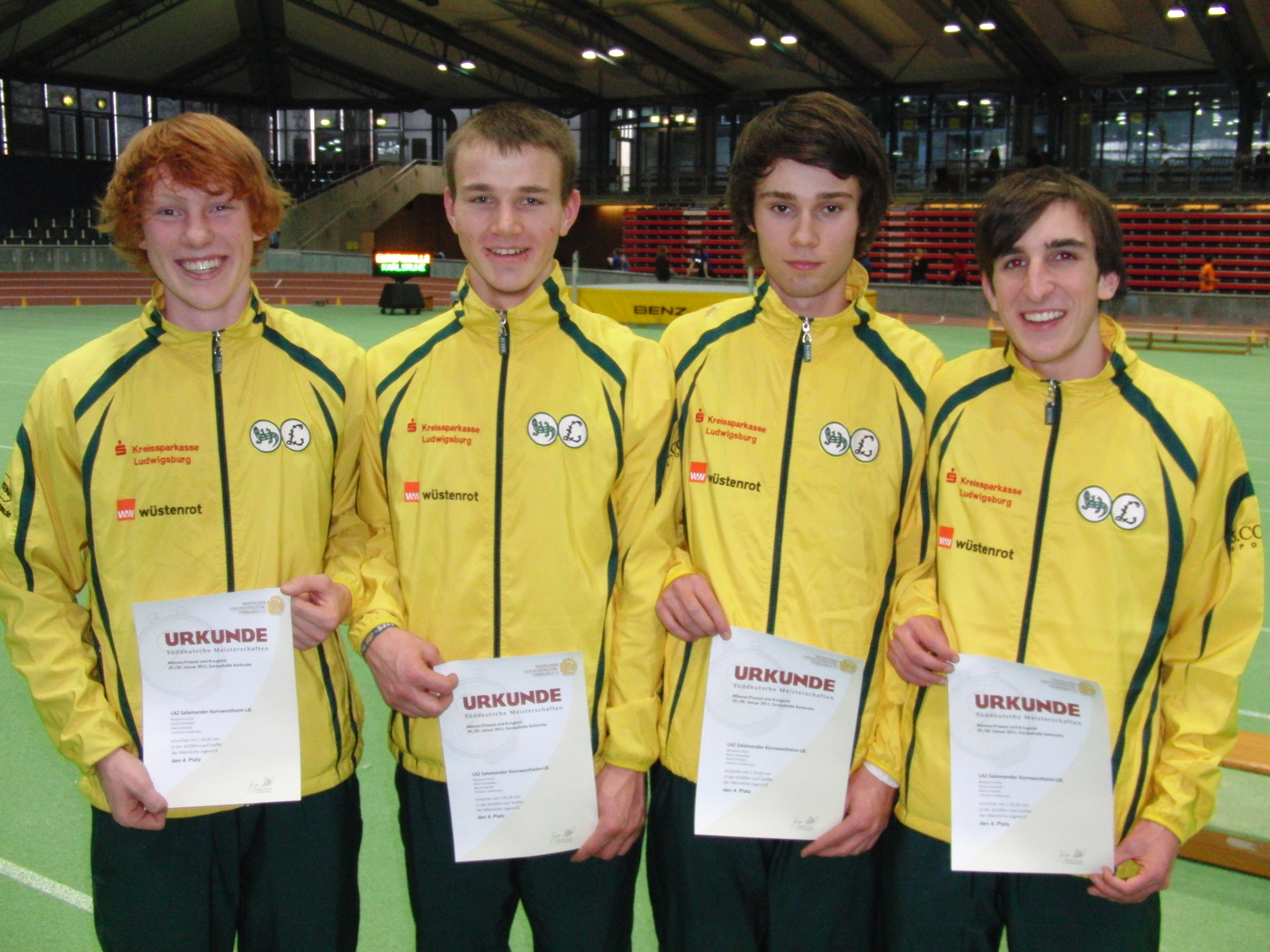 Ebenfalls knapp an einer Medaille vorbei lief die 4x200m Staffel der männlichen Jugend B. Mit einer deutlichen Steigerung gegenüber den Baden-Württembergischen Meisterschaften konnten sich Benny Kuhn, Kevin Schneider, Marcel Heider und Clemens Hanßmann in 1:35,45 Minuten als viertschnellste Staffeln des Südens behaupten.