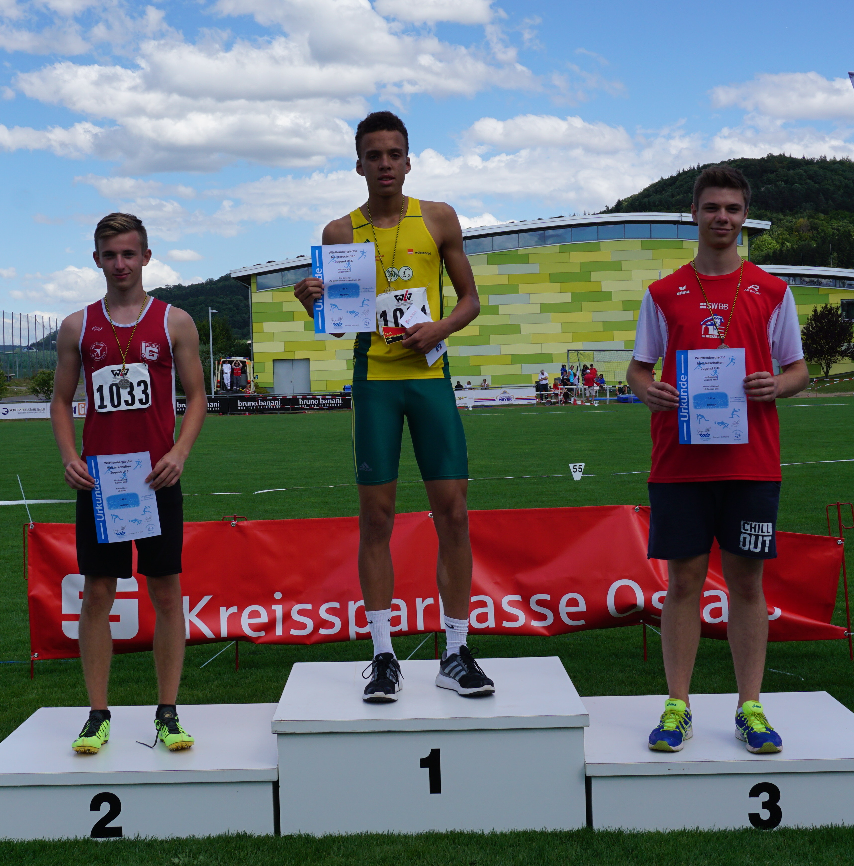 Für die Sensation des Tages sorgte Eric Massing im Hochsprungwettbewerb der Altersklasse M15. Der „Basketballer“ sprang bei seinen ersten Meisterschaften unglaubliche 1,98 m und holte sich vor Niklas Meier (LG Filder) den Titel. Er erhöhte seine Bestleistung, die er bei Jugend trainiert für Olympia aufgestellt hatte, um 18 cm und setzte sich somit an die Spitze der Deutschen Bestenliste des Jahrgangs 2000.